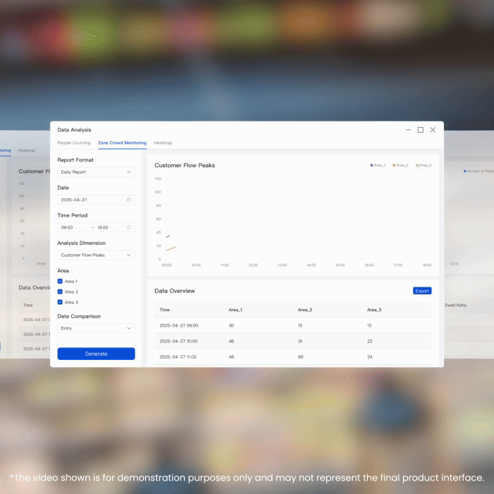 Tracks foot traffic through designated zones and provides exportable trend data.